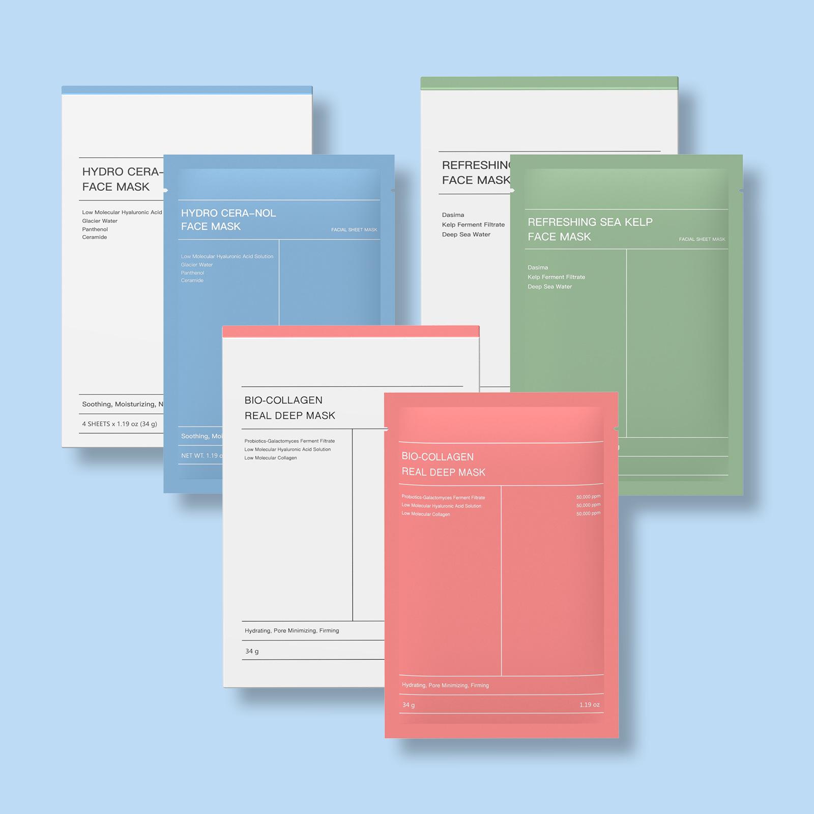 Variants: Available in pink, blue, yellow, and green collagen masks; packaging includes 1-piece, 4-piece, or 5-